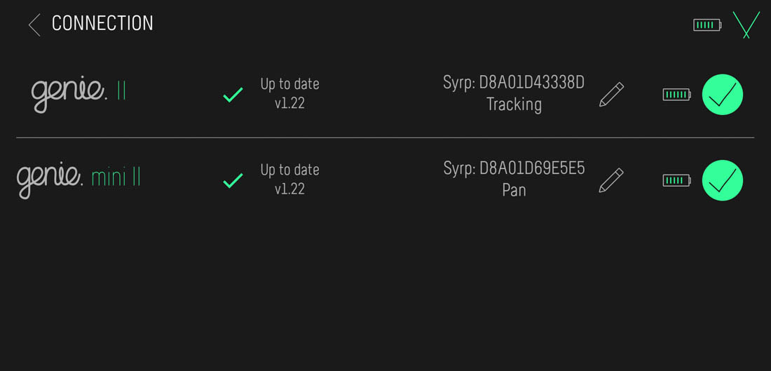 Nella schermata iniziale visualizzeremo i vari dispositivi a cui collegarci (FIG.1). Di ogni dispositivo, si visualizzerà la versione firmware installata (potrà essere presente la notifica di un nuovo aggiornamento disponibile) e lo stato di carica della batteria.
