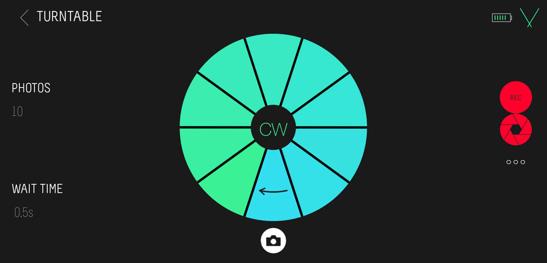 Come possiamo vedere dalla Fig. X, potremo andare ad impostare il numero di scatti (PHOTOS), l’intervallo tra due scatti (WAIT TIME) e il verso di rotazione (CW senso orario, CCW senso antiorario).