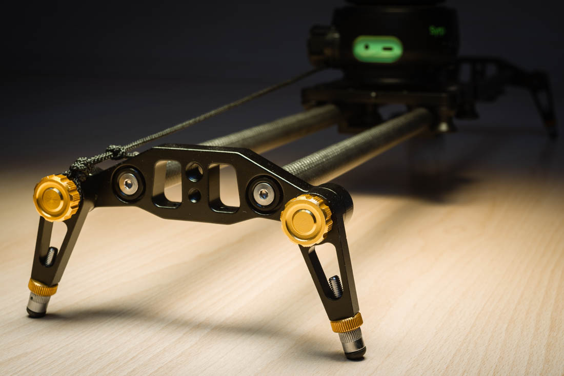 Di serie, lo slider è munito di 4 piedini regolabili posizionati sulle due estremità; in corrispondenza di queste ultime, troviamo un fori da 3/8” e due fori da ¼” estremamente utili per fissare lo slider ad un cavalletto o un supporto differente.