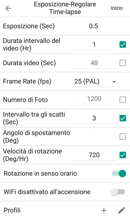 Per concludere dovremo decidere se la rotazione avverrà in senso orario o in senso antiorario e se disattivare il WiFi all’accensione in modo da limitare il consumo delle pile.