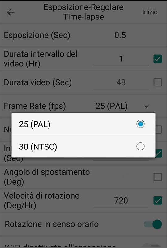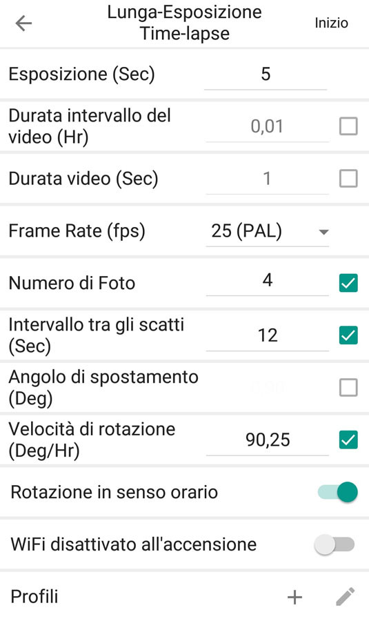 Il primo parametro da selezionare è il tempo di esposizione (in secondi), dopo di che dovremo decidere il numero di foto che si vogliono realizzare.