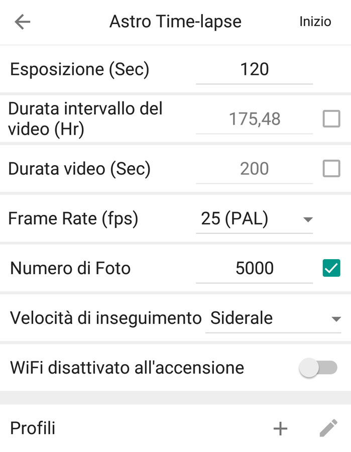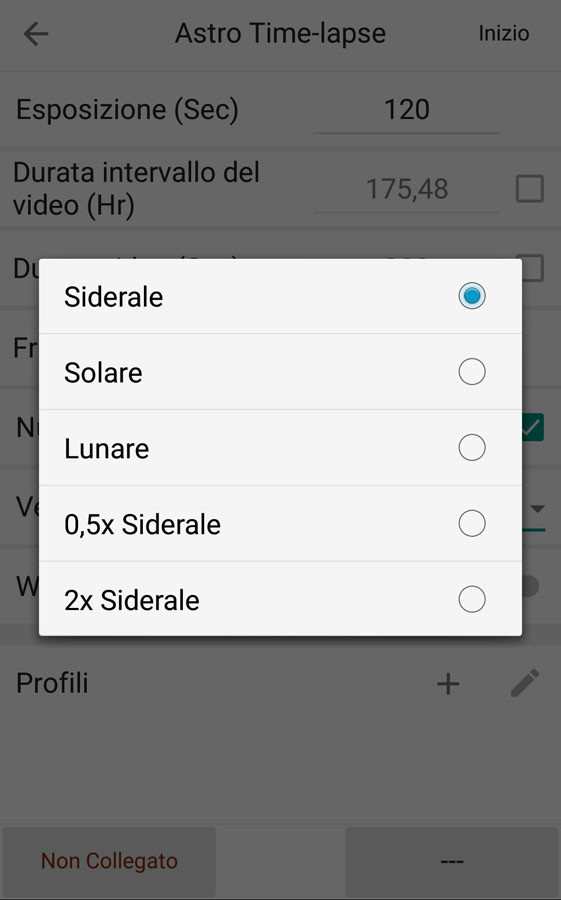 Una volta terminato l’allineamento e regolato l’inquadratura per il nostro scatto, mediante la seconda testa fissata sull’astro-inseguitore, torniamo sulla nostra app per impostare i vari parametri della sequenza.